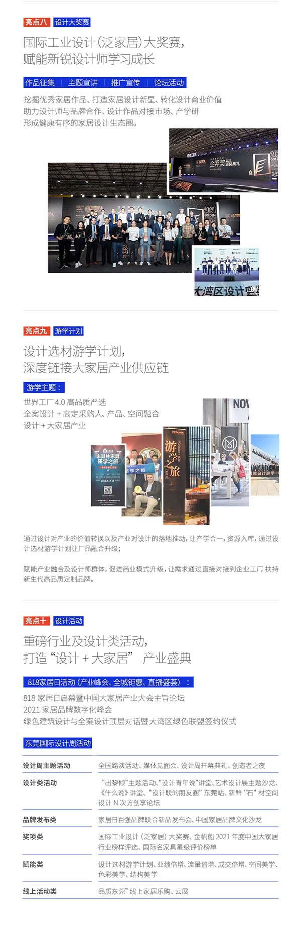 20多年来,展会对东莞大家居产业有两个重大影响。一是立足湾区,在东莞聚集了大量的家居企业、家居人才和家居业服务商等等,为产业实现共融;二是对话世界,将全国乃至全球的家具设计、家具产品聚在了一起,让东莞成为了行业最新产品、最新设计和最新模式的集中展示中心。正因如此,展会成为大家居产业链的重要一环。随着社会环境、家具企业、消费需求的变化,展会的内核也在不断迭代,作为链接产业生态的平台,东莞国际设计周又开启了新的思考。想了解这个项目,请联系我!