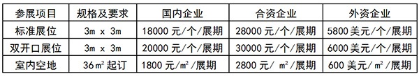 标准展位配置:中英文楣板、日光灯两盏、隔板(高度250cm,可用高度246cm)、洽谈桌一张、椅子两把、可容400W/220V电源插座一个及地毯;注:参展费用含(发票、咨询服务)。