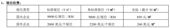 注:A. 标准展位配备:标准展台(规格:3x3米),展位备注:高2.5米、三面围板、展位地毯铺设、中英文双语楣板字、咨询桌一张、折椅两把、废纸篓一个、射灯或日光灯两个、220V 插座一个、展位每日保洁、会刊登录、参展商证件。